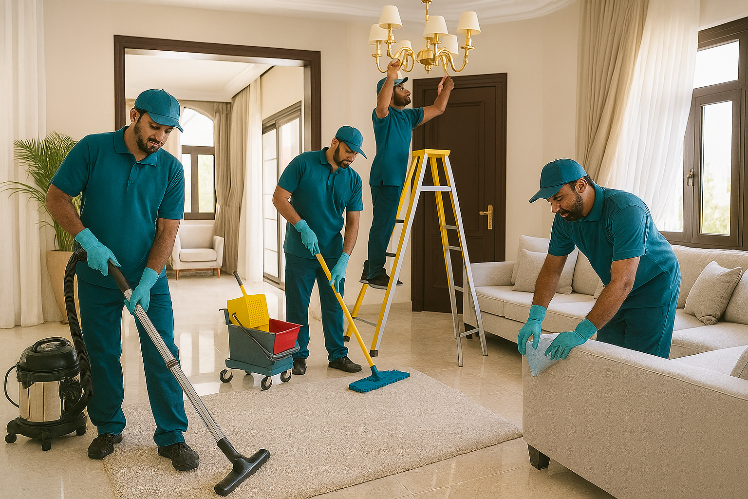 نقدم خدمات شاملة لتنظيف الفلل من الداخل والخارج، تشمل تنظيف الأرضيات، النوافذ، المطابخ، الحمامات، والتخلص من الغبار والأوساخ العالقة، مع ضمان تعقيم شامل لكافة المساحات.